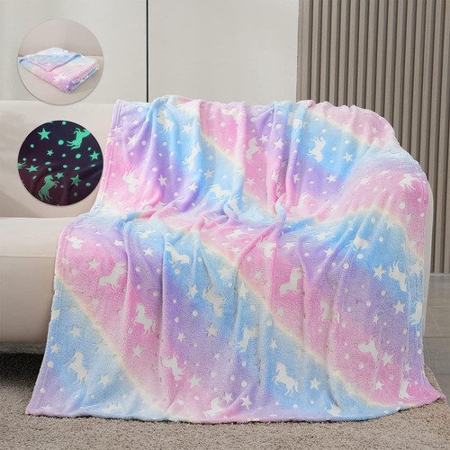 Manta Frazada Luminosa Soft Brilla En Oscuridad 1 1/2 Plaza Color Unicornio Rosa Diseño De La Tela Estampado