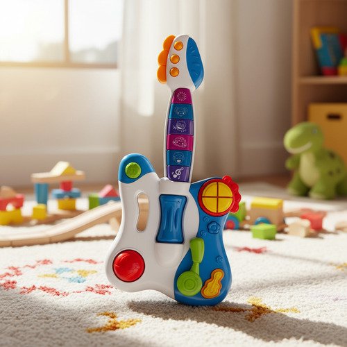 Guitarra con sonidos diferentes que ayudarán al bebé a reconocer varias clases de música, a desarrollar el sentido auditivo, el sentido táctil y a promover la coordinación mano-ojo. La llave de diversos colores produce diversos tipos de música, que ayuda a practicar la capacidad de memorización del bebé.
