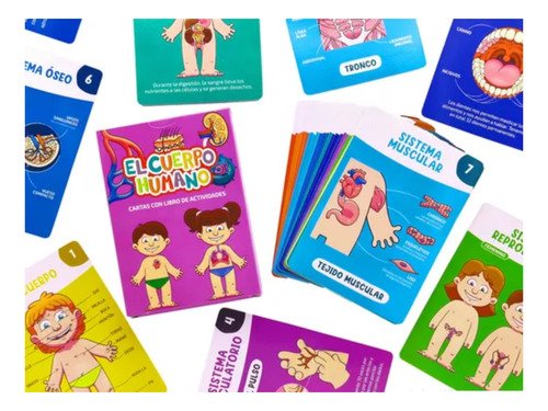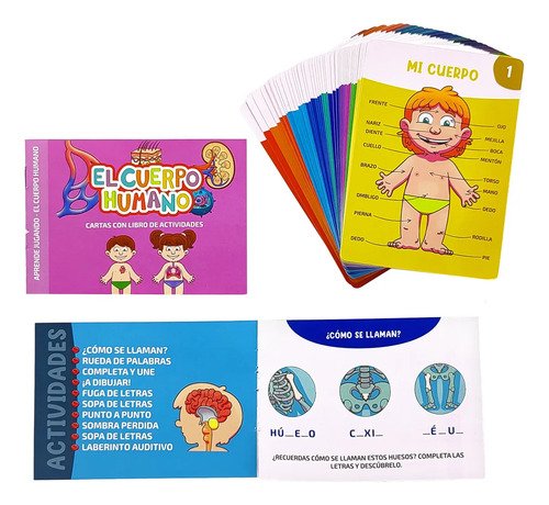 Las cartas del cuerpo humano traen en su dorso datos curiosos para aprender aún más y también vienen con un libro lleno de actividades.