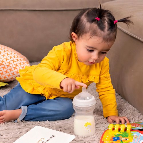 La tetina del biberón es inclinada, redondeada y alargada, fabricada en silicón extra suave que simula el seno materno. Además, posee una doble válvula anticólicos que reduce la ingesta de aire y la aparición de reflujo, evitando malestares y facilitando la hora de la siesta tras la alimentación.