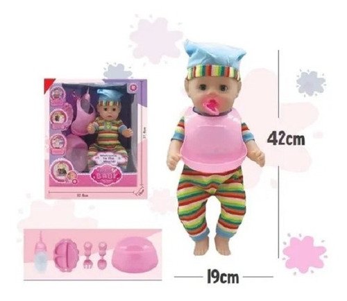 Incluye: babero plastico, plato, chupete, mamadera, pelela