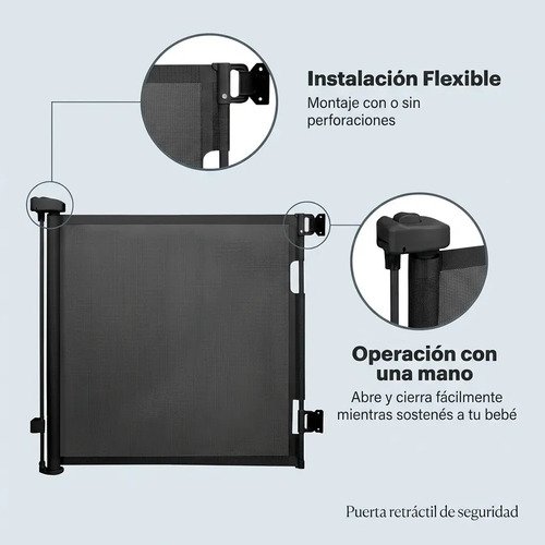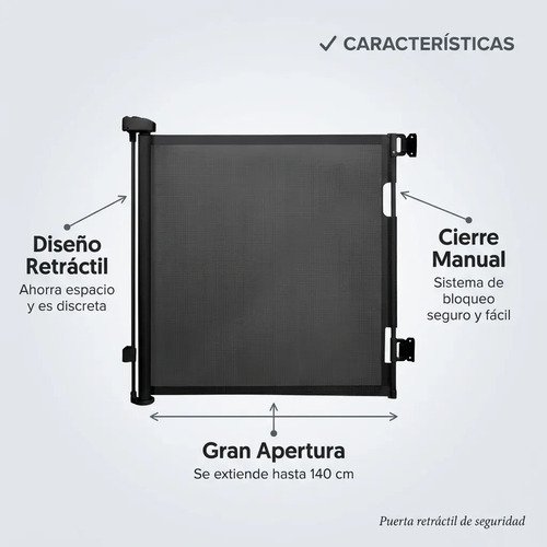 Está pensada para usar con niños de 6 a 24 meses y mascotas pequeñas. Se puede instalar con o sin perforaciones, según el tipo de superficie, y cuenta con un sistema de cierre manual seguro que evita aperturas accidentales.